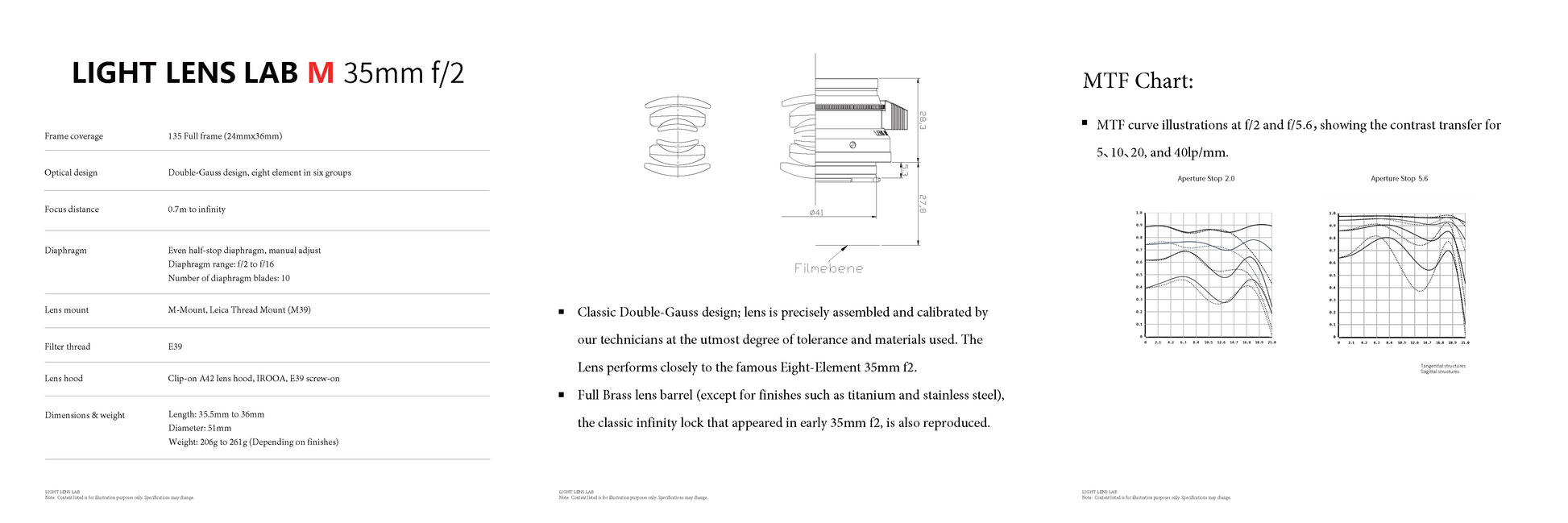 - Full brass body, elements are made in-house with lanthanide and lead infused. Fully compatible with all LTM/M-Mount cameras.